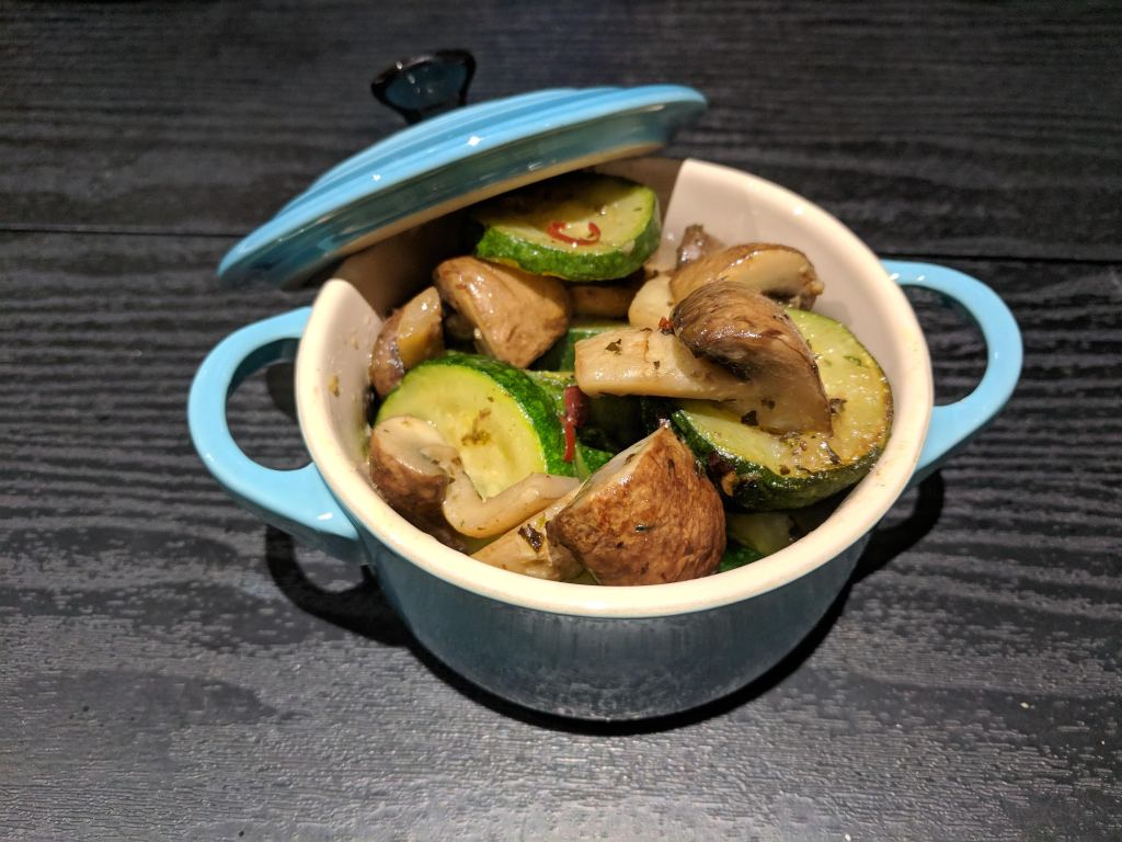1. Heat a non-stick frying pan with olive oil, garlic and chilli using low heat for a few minutes. Add the courgettes and mushrooms.