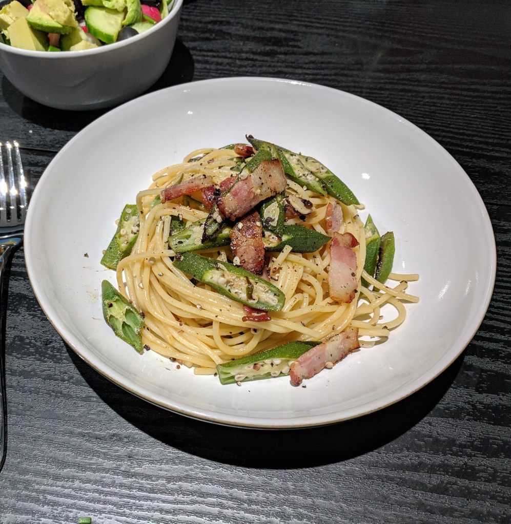 This dish is a balanced diet pasta as it provides a good amount of protein, carbs, and fats as macronutrients. Okra provides fiber, folate, calcium, magnesium, vitamin C, and K, but also very low calories and no cholesterol. It is one of the good ingredients in a weight-reduction diet. Folate is beneficial to women during the preconception period to decrease the possibility of neural tube defects in the newborn. Gumbo pods contain edible seeds and have a unique texture. When they are fried, their sticky texture slightly goes away so if you are not big fan of the texture, this is a good way to cook and eat it.