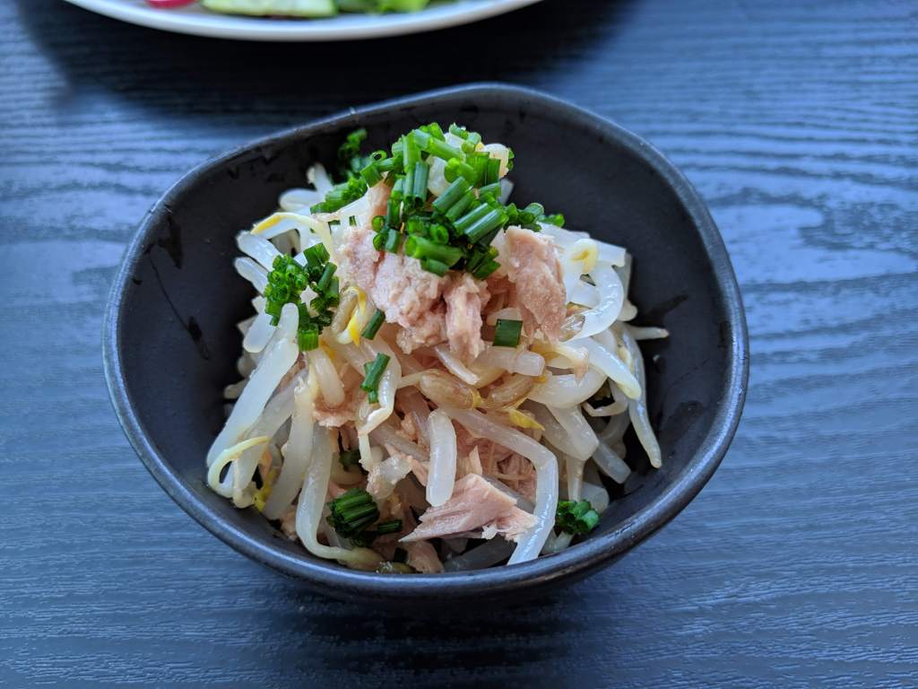 2. In a small bowl, mix the steamed bean sprouts with tuna, sesame oil and ponzu.