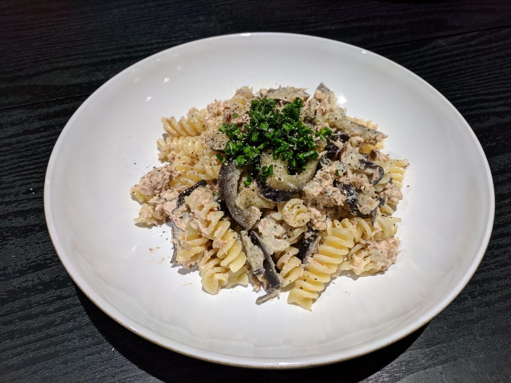 4. Once the aubergine is cooked, the tuna mix and hot drained pasta to frying pan. Mix well. If it needs a little more moisture, add a splash of the pasta-cooking water.