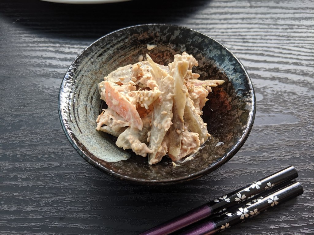 Description: Root vegetable salad. Typical combination of burdock and carrots, but at the same time, it is an amazing combination with tuna-mayo. This can be an appetizer, izakaya-style dish or side dish.