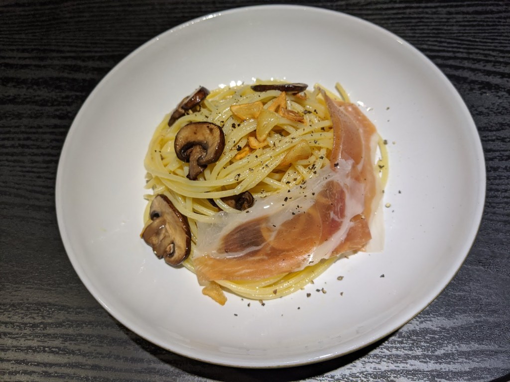 Description: Simple olive oil pasta just with mushroom and ham. Can be served hot or cold.