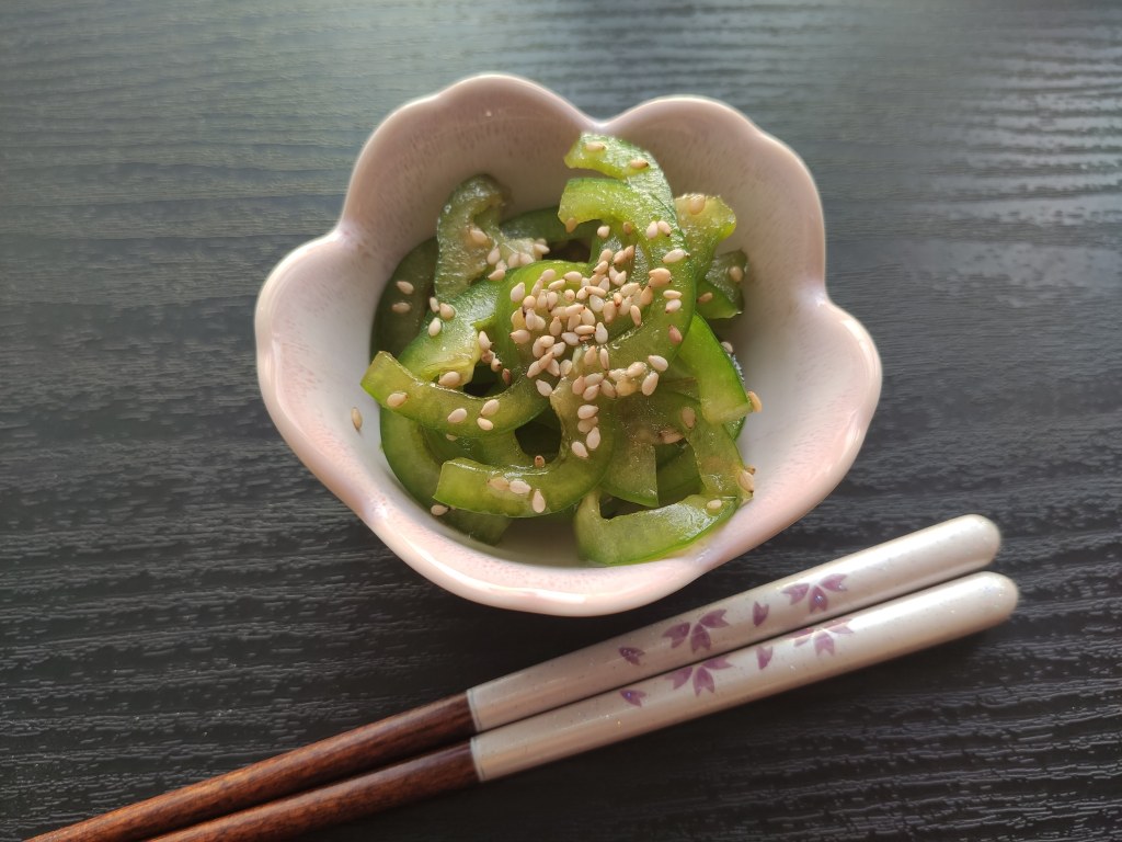 1. In a small bowl, mix the green pepper with salt, soy sauce, garlic puree, bonito flakes and sesame oil.