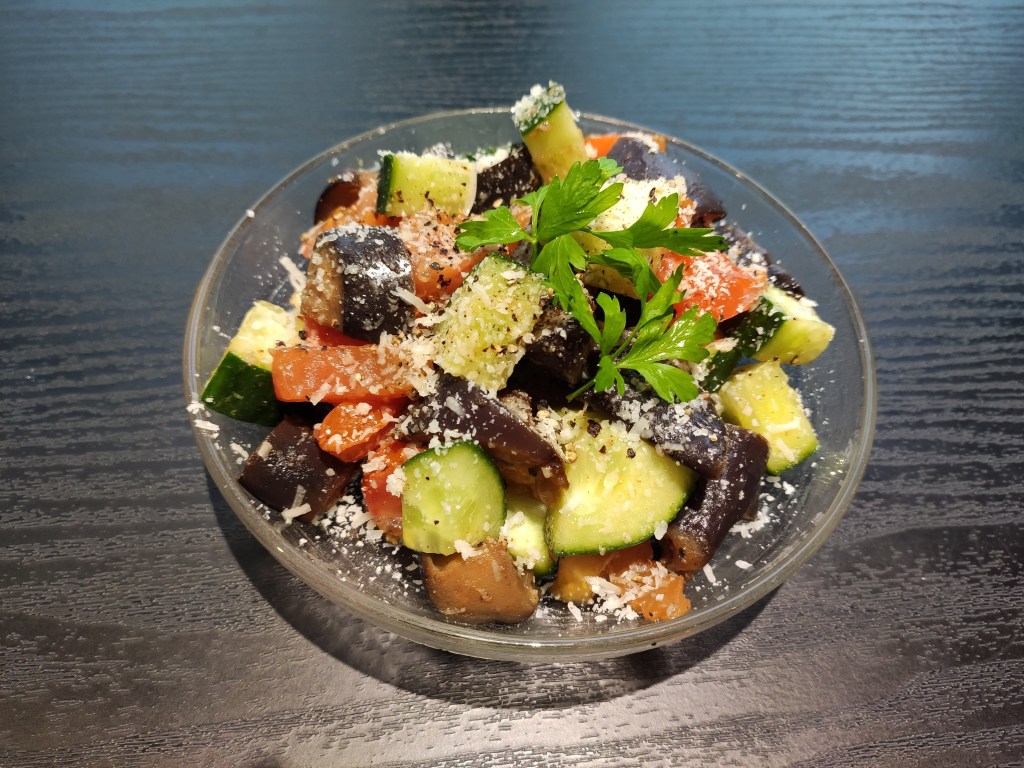 Description: Refreshing salad using summer vegetables. A salad but it’s quite filling.