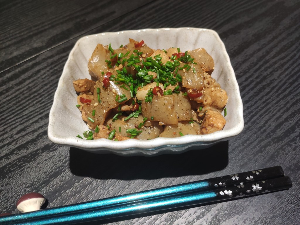 Ippin-ryori means one dish in Japanese. In Japanese restaurants (including izakaya), it usually starts with drinks (such as beer) and some appetizers (known as “otsumami”). Ippin-ryori varies from restaurant to restaurant and from family to family. This is one of my “ippin-ryori”. Only pork and konnyaku as the main ingredients but seasonings make this dish delicious. Beer but also white wine goes well with this. Of course, Nihonshu (Japanese sake) is also a perfect match for this.