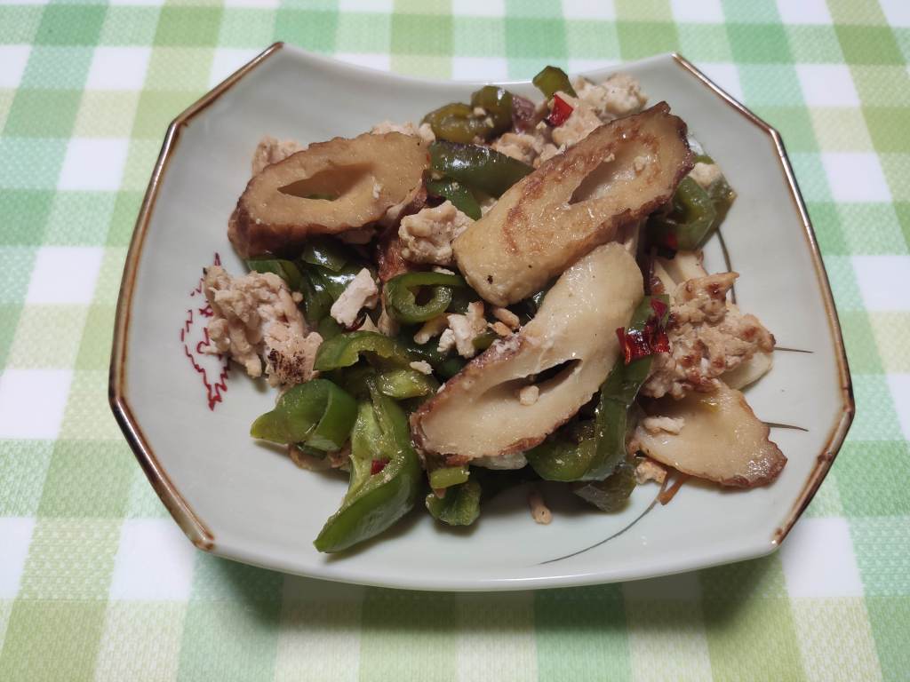 1. In a large non-stick frying pan, add the chikuwa, mince meat and green peppers over medium heat, stirring regularly.
