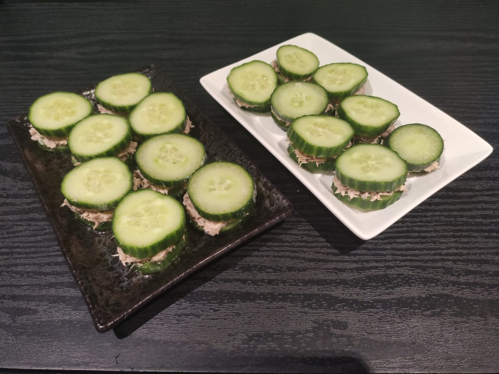 2. Sandwich the tuna mixture (about 1-2 teaspoons depending on the cucumber diameter) with the cucumber slices.