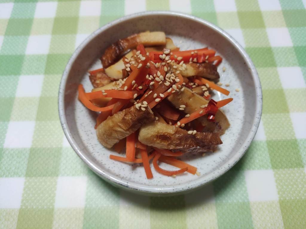 1. In a non-stick frying pan, add the sesame oil and dried chilli, then fry the carrots and chikuwa for a few minutes.