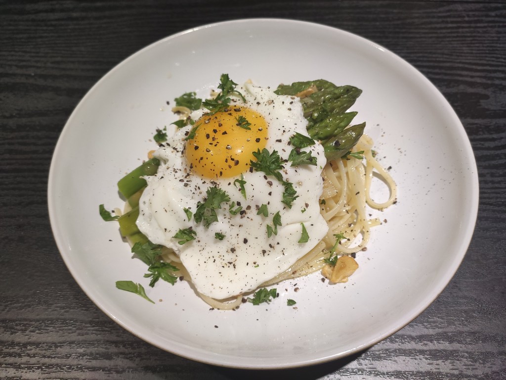 3. Stir in the pasta and asparagus, change the heat to medium and cook for a couple of minutes. Then place it on a plate.
